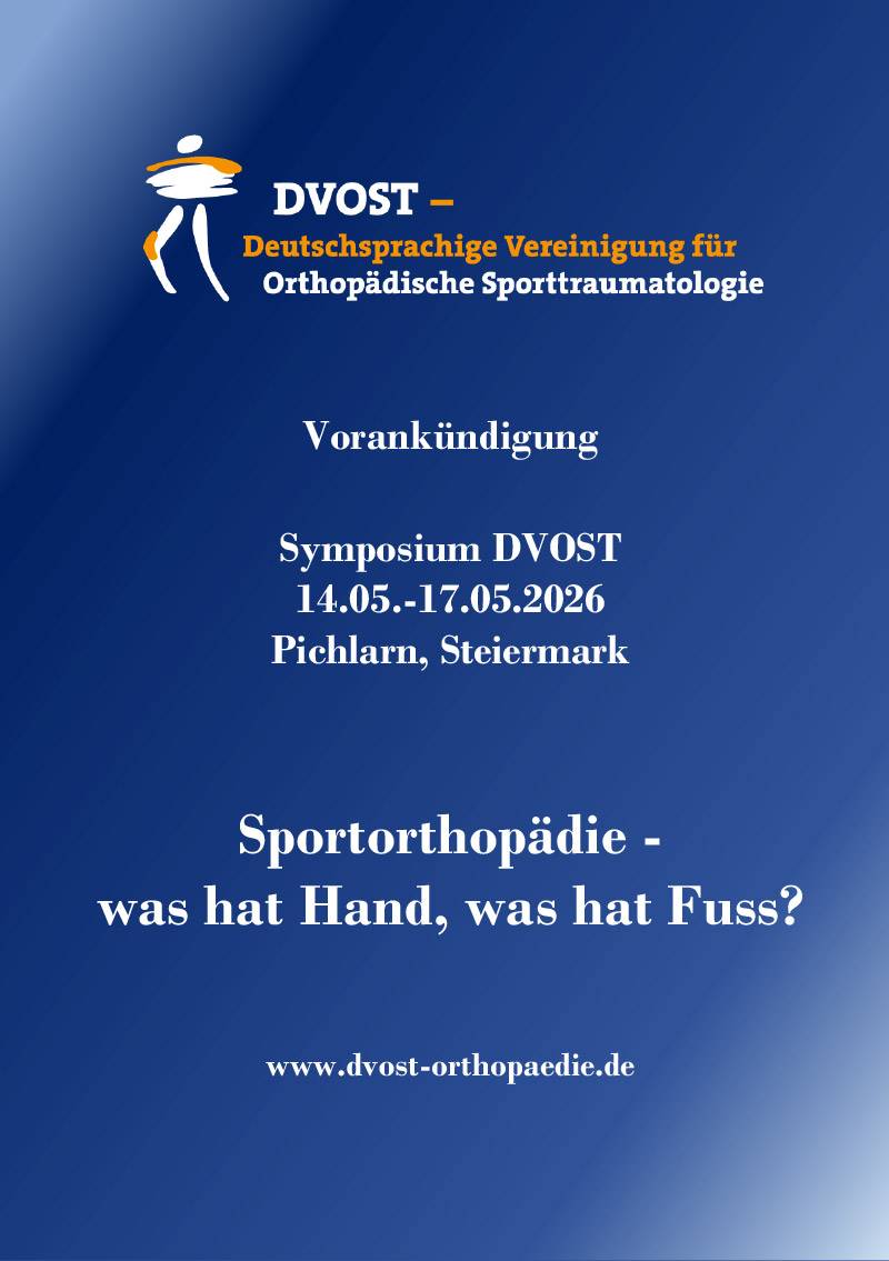Die DVOST ist aktuell in Vorbereitungen für kommende Symposium 2026, der Termin steht bereits fest: 14.-17.05.2026 in Schloß Pichlarn. Das Thema lautet: "Sportorthopädie - Was hat Hand, was hat Fuß?".